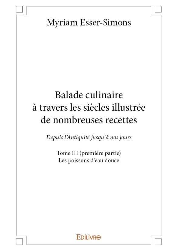Le Tome III (première partie) de notre ouvrage Balade culinaire à travers les siècles (allant de l’Antiquité jusqu’à nos jours) est consacré aux poissons d’eau douce. Nous nous intéressons à l’anguille, au brochet, à la carpe, au saumon et à la truite. Le livre comprend des introductions historiques à chacun de ces poissons d’eau douce, ainsi que de nombreuses recettes. Cette première partie du Tome III se termine par des références bibliographiques.