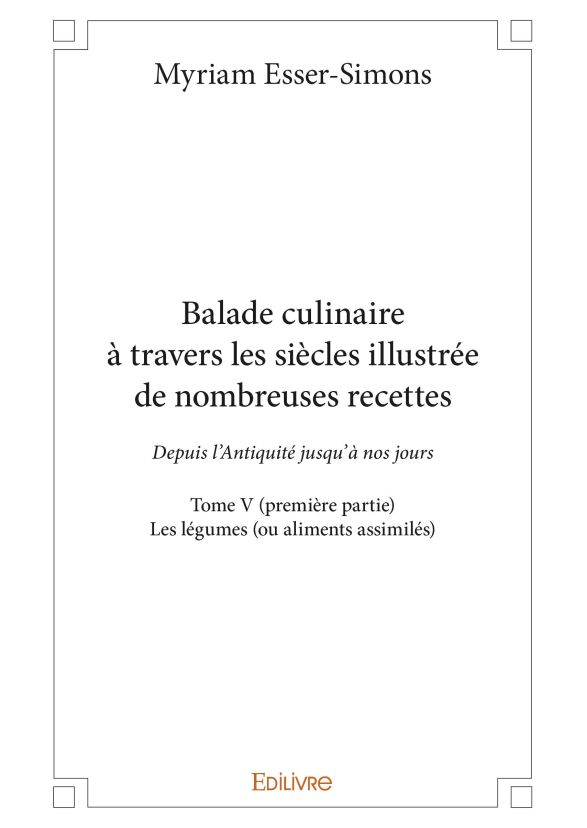 Le tome V (première partie) de notre ouvrage Balade culinaire à travers les siècles (allant de l’Antiquité jusqu’à nos jours) est consacré aux légumes (ou aliments assimilés), classés par ordre alphabétique. En effet, ceux-ci constituent aujourd’hui une partie importante de l’alimentation : le lecteur trouvera donc, dans ce livre, de nombreuses recettes, relevant aussi bien de la cuisine classique que de l’inventivité des chefs étoilés actuels. Le livre comprend également des introductions historiques aux différents légumes étudiés. Cette première partie du tome V se termine par des références bibliographiques et des sources informatiques. La suite des légumes fera l’objet de la deuxième partie du tome V.